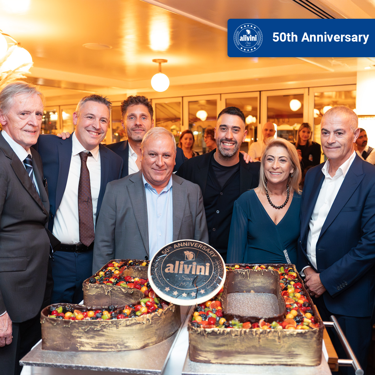 Moments later, the grand cake arrived — a golden number “50”, covered in rich chocolate, bright fruit, and topped with the Alivini emblem. Cameras flashed, cheers erupted, and glasses were raised high.
